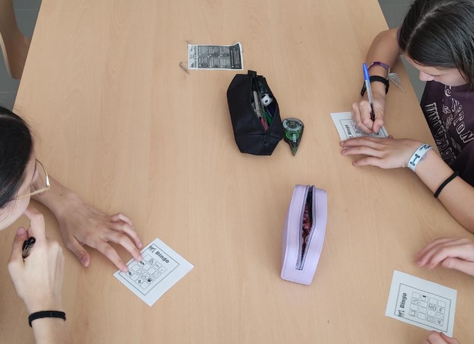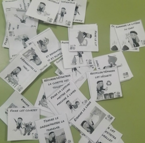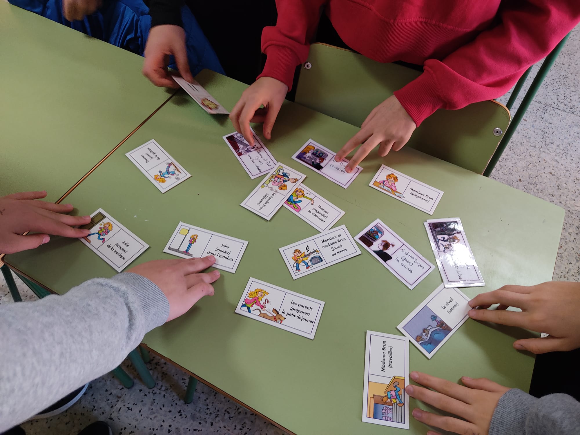 Esta vez de 2º como primer idioma Francés, estaban con las tareas domésticas. Y aquí, se realizó un juego manipulativo. Esta vez consistía en una serie de cartas con el verbo y un dibujo sobre las tareas domésticas. Por parejas y por turnos, uno de los componentes tenía que adivinar qué tarea era la del compañer@. Pero, y aquí viene lo divertido, en la primera ronda era de mímica; la segunda ronda era de decir una sola palabra para que el compañero adivinara la tarea, y en la tercera era de describir esa tarea. La verdad, es que se creó un clima distendido y jovial en el aula.