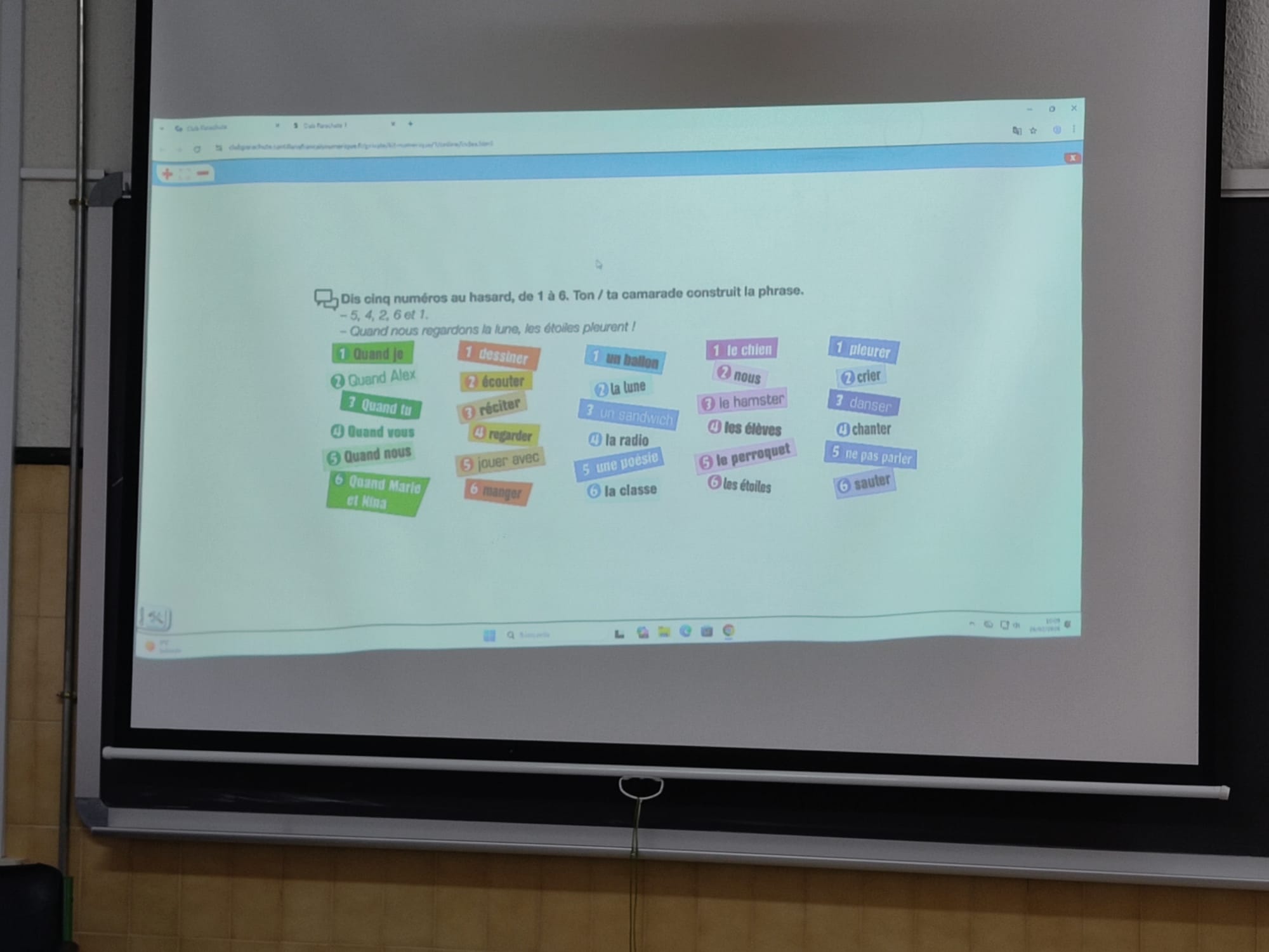 La segunda actividad, desarrollada con otro grupo-clase-nivel (2ºESO, segunda lengua), fue la creación de frases sin sentido. proyectado en la pantalla, se les da las partes de una frase simple (sujeto, verbo y otros complementos).